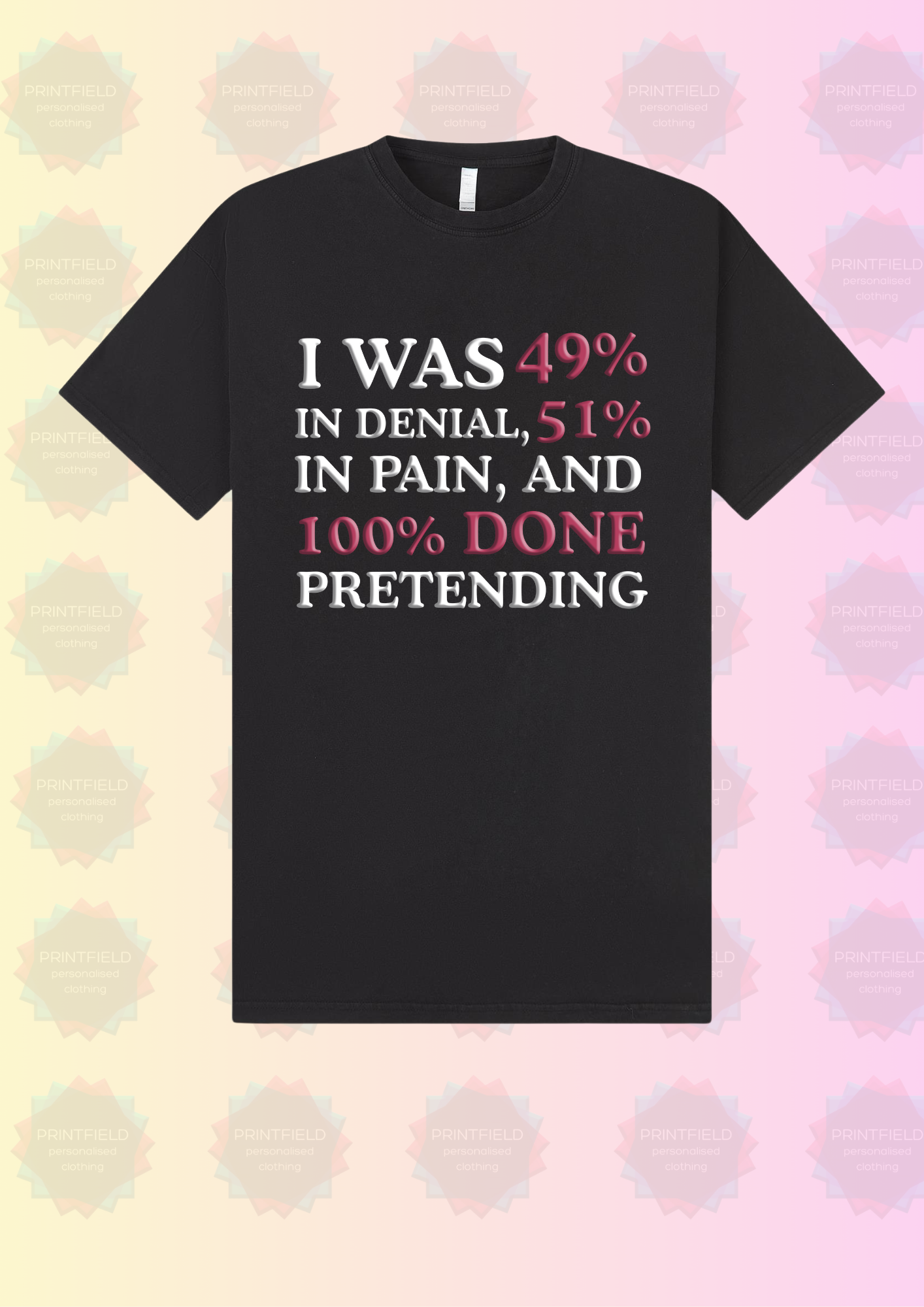 This bold graphic tee says what many are too afraid to admit: it hurt, but now you're healing — and thriving. Featuring the powerful message “I was 49% in denial, 51% in pain, and 100% done pretending,” it’s a fierce statement of strength after toxic friendships, breakups, or life lessons that came with a price.