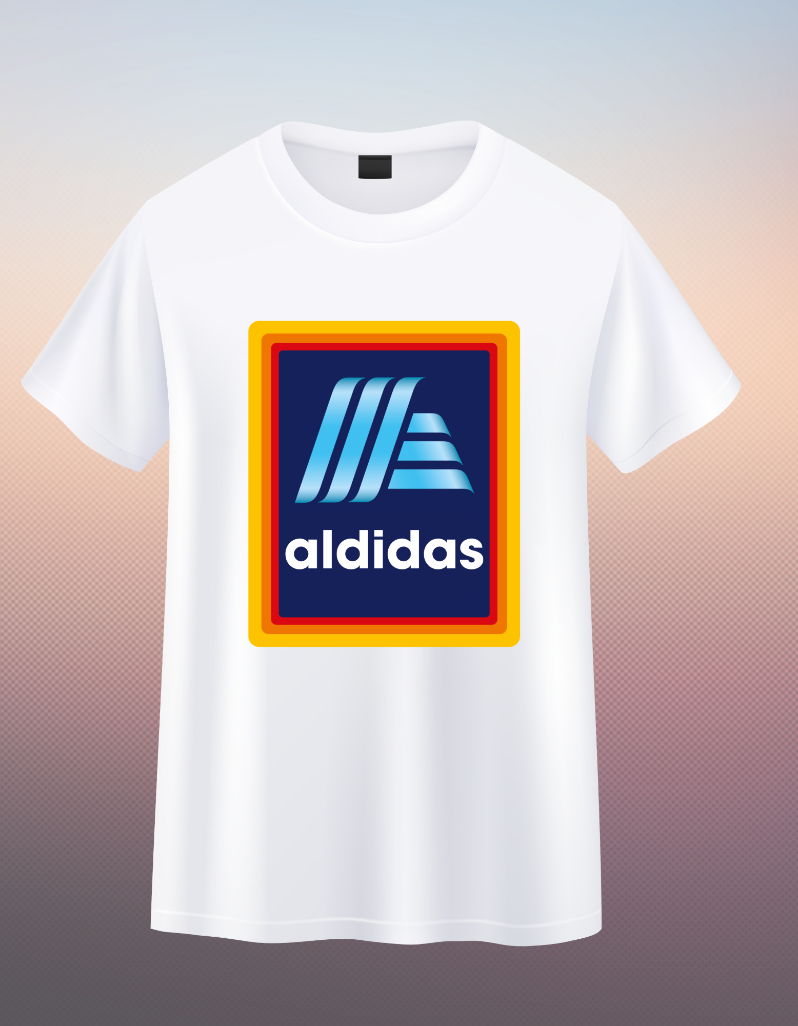 The design reimagines the Aldi logo with a sporty twist, transforming it into the bold and hilarious "ALDIDAS" graphic. Featuring the familiar Aldi color scheme and typography combined with a nod to athletic branding, this parody strikes the perfect balance between clever and comedic.
