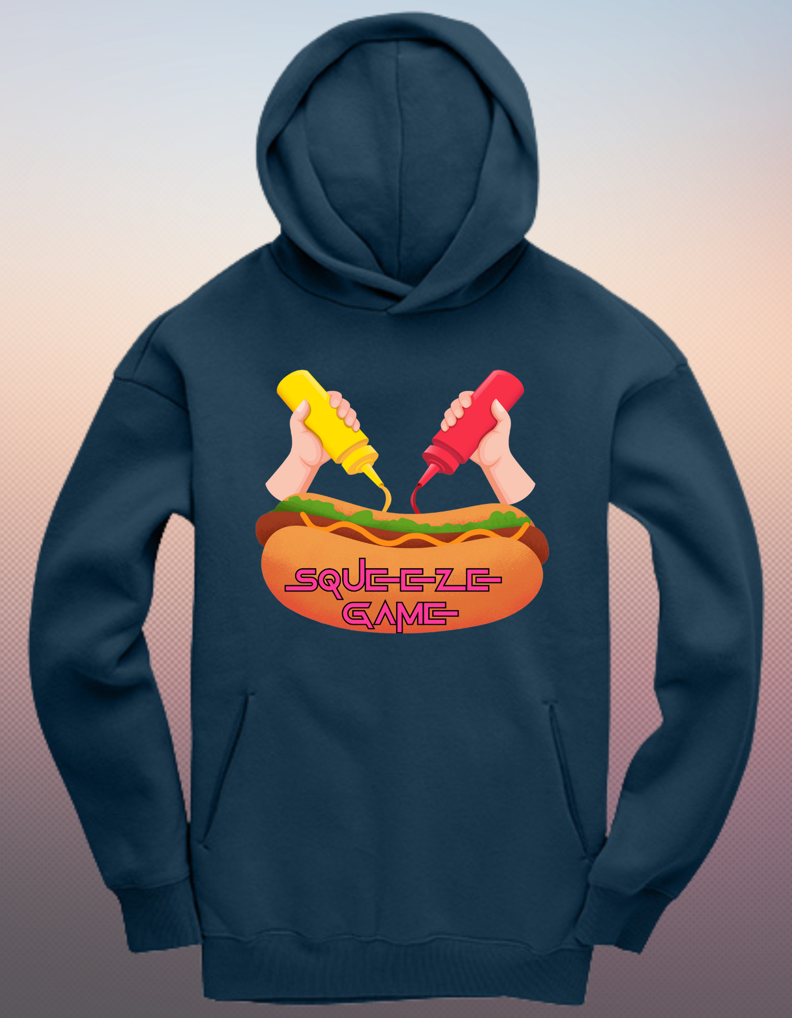 The design is a playful twist on the iconic Squid Game concept, replacing the intensity with culinary comedy. The centerpiece features two cartoon hands squeezing bright streams of mustard and ketchup onto a hotdog, creating a laugh-out-loud parody titled "Squeeze Game." The vibrant colors and dynamic illustration bring the humor to life, making this hoodie a standout piece for fans of witty designs.