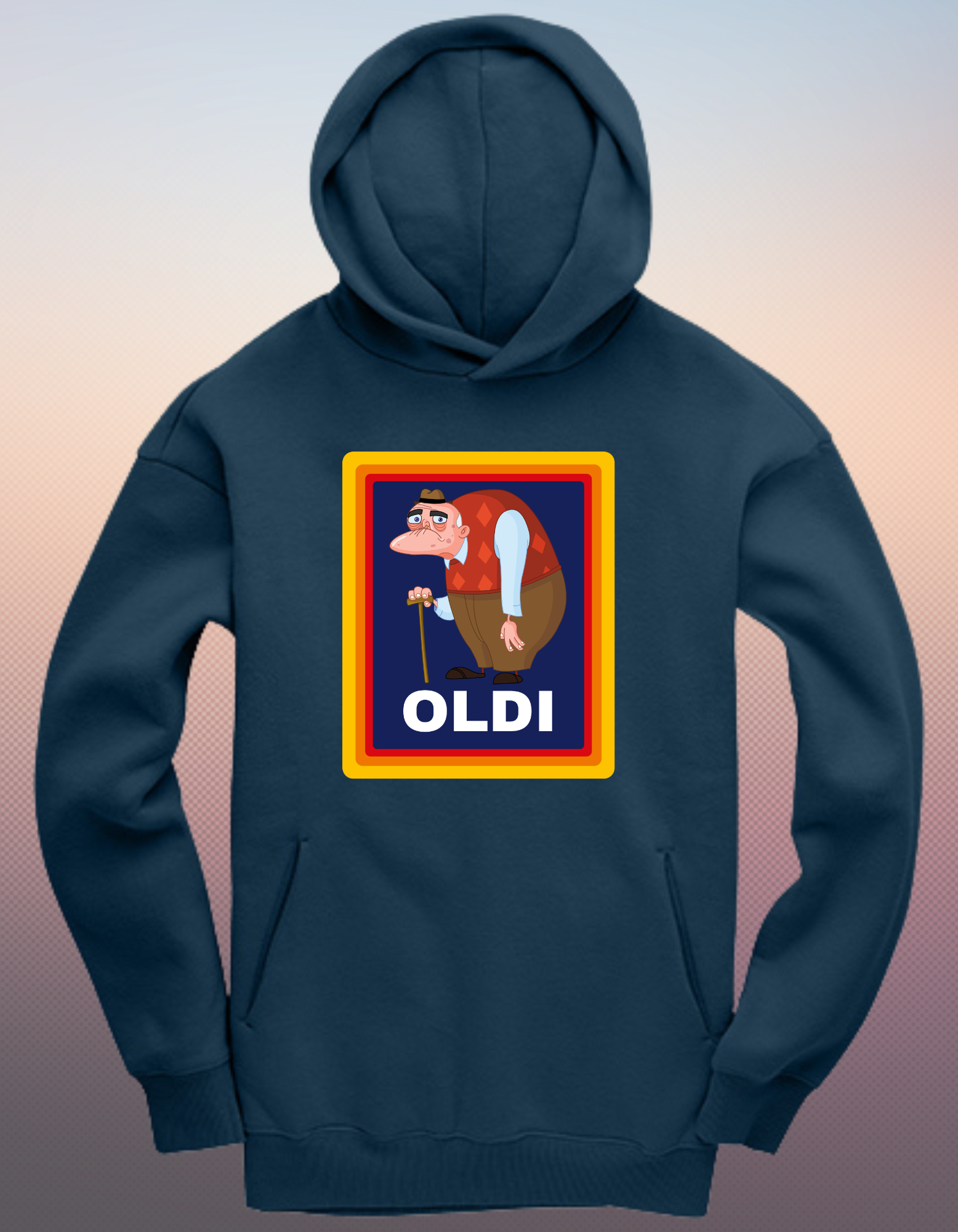 Get ready to turn heads and spark smiles with the standout OLDI design on our Gemini Oversized Hoodie. This funny take on the iconic Aldi logo swaps out the familiar with a playful twist—a delightfully bald, old guy as the star of the show. The bold, retro-inspired typography spells out "OLDI," making it instantly recognizable yet refreshingly unique.